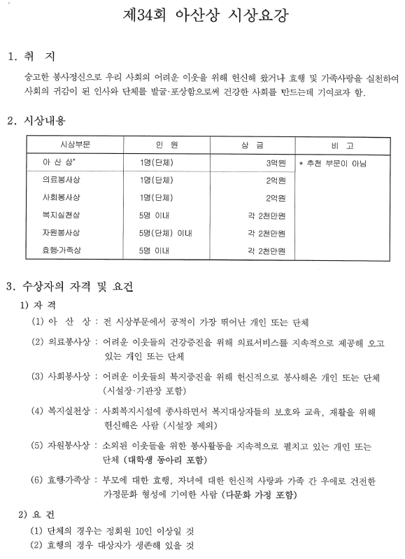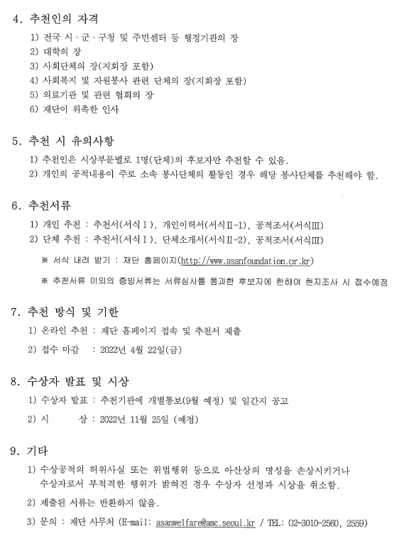 아산사회복지재단에서 시행하고 있는 제34회 아산상 수상 후보 추천을 받고있습니다.