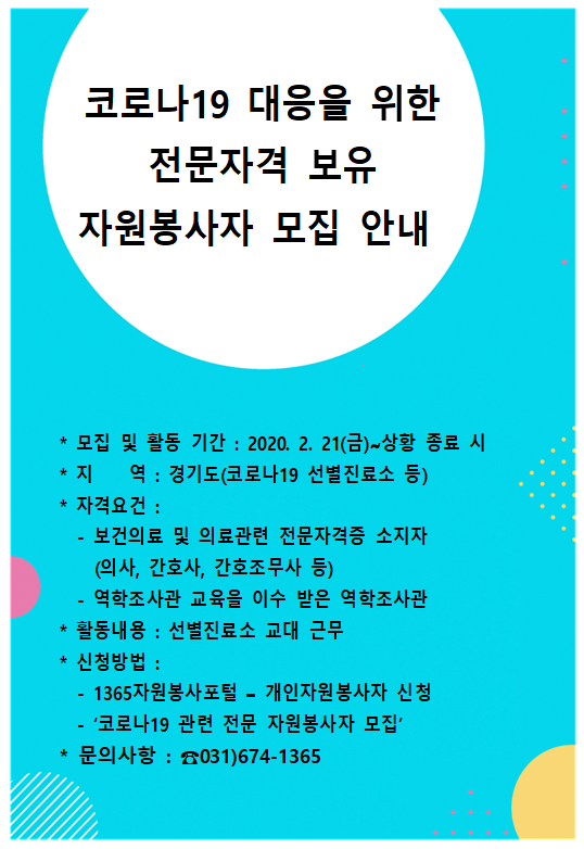 코로나19(COVID-19)관련 전문 자원봉사자를 모집합니다.