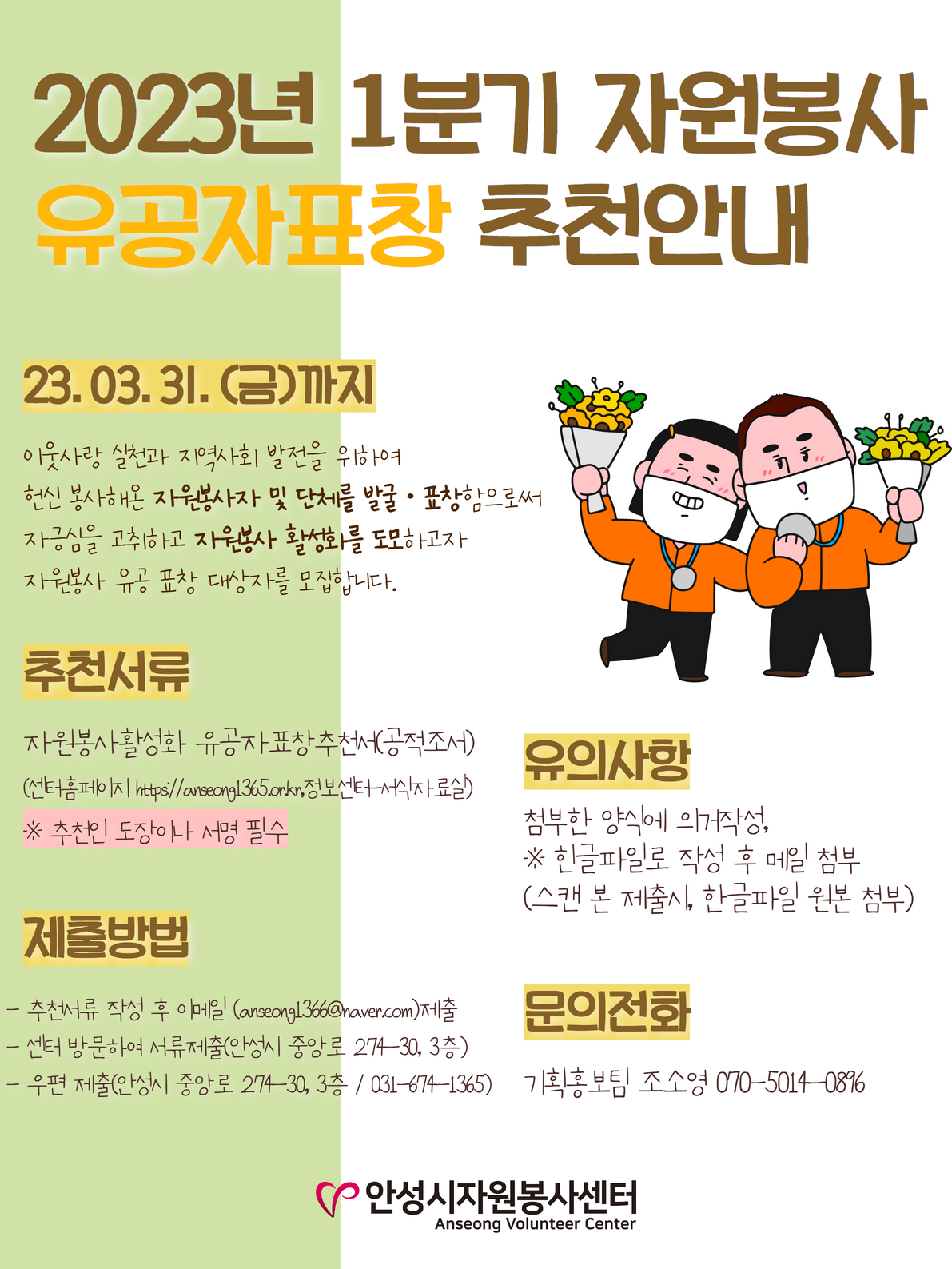 2023년 자원봉사활성화 1분기 유공자 표창 추천 안내 파일을 참고하여