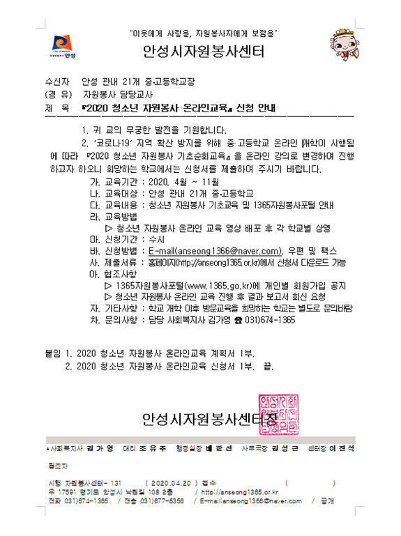 2020 청소년 자원봉사 온라인 기초교육 신청 안내