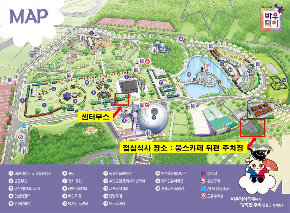 * 메인게이트, 안성장터, 테마파크, 소방체험에 배치 된 자원봉사자분들은 공연 일정이나 부스 운영이 끝나면 메인무대로 이동하여 계속 봉사활동을 진행해주시길 바랍니다.