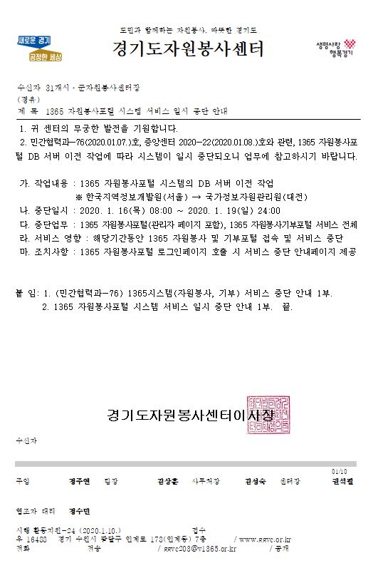<1365자원봉사포털 시스템 서비스 중단으로 2020년 1월 16일(목) 8시부터 1월 19일(일) 24시까지