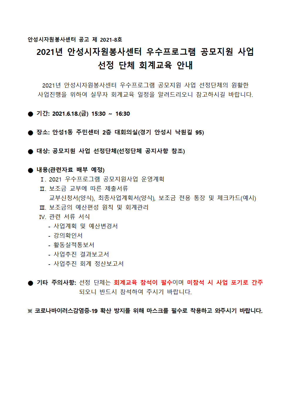 2021 안성시자원봉사 우수프로그램 공모지원 사업 선정 단체 회계교육 안내