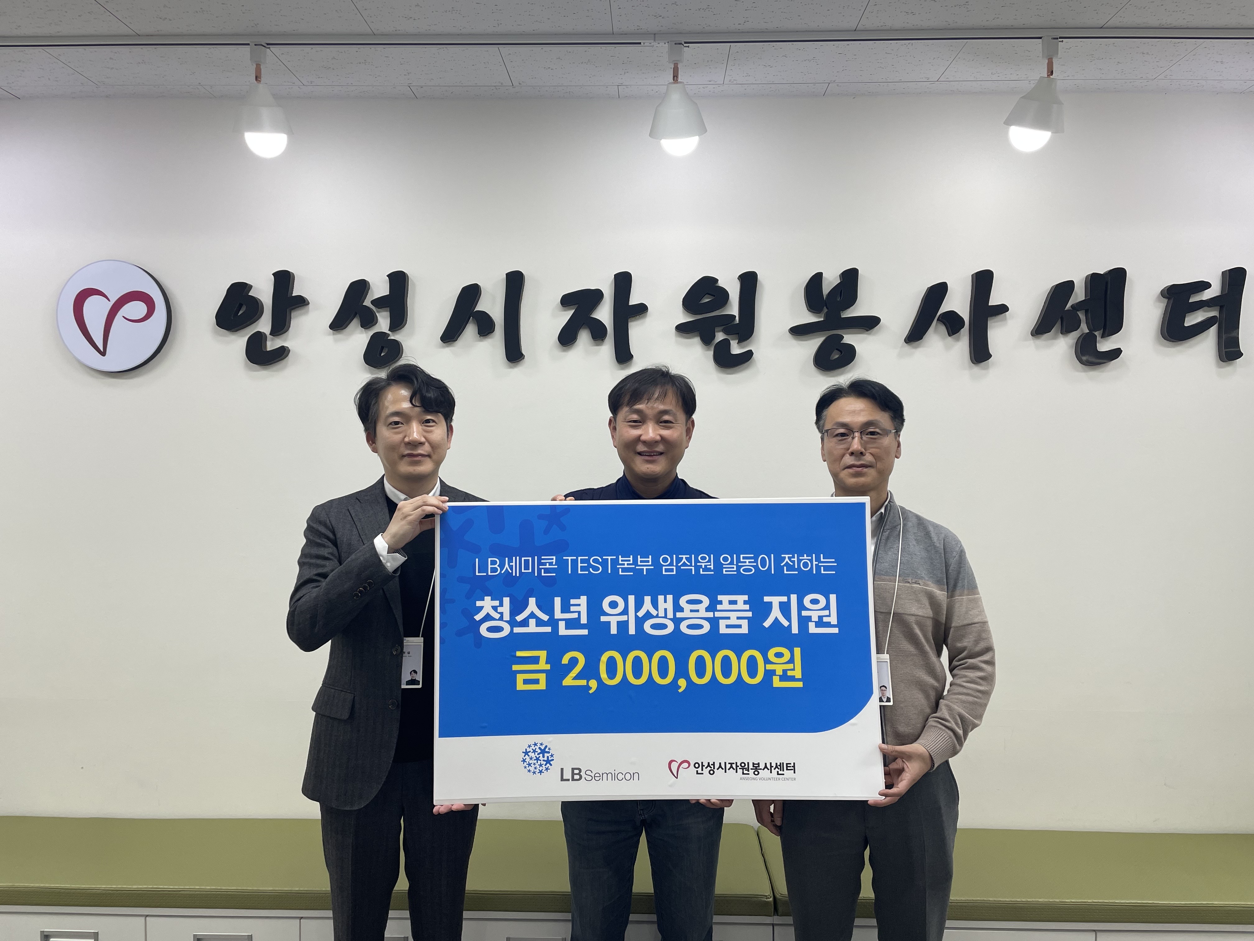 LB세미콘 TEST본부팀 임직원은 지난 23일 지역의 청소년을 위한 지정기부금 200만원을 안성시자원봉사센터에 기탁했다. 이는 저소득층 청소년들이 위생용품 구입에 어려움을 겪고 있다는 소식에 전 구성원이 십시일반 모은 금액이다. 기탁받은 지원금은 2월 LB세미콘 안성 사업장 직원들이 기탁한 우수리자금 250만원과 함께 청소년 위생용품 구매 지원 비용으로 사용될 예정이다.