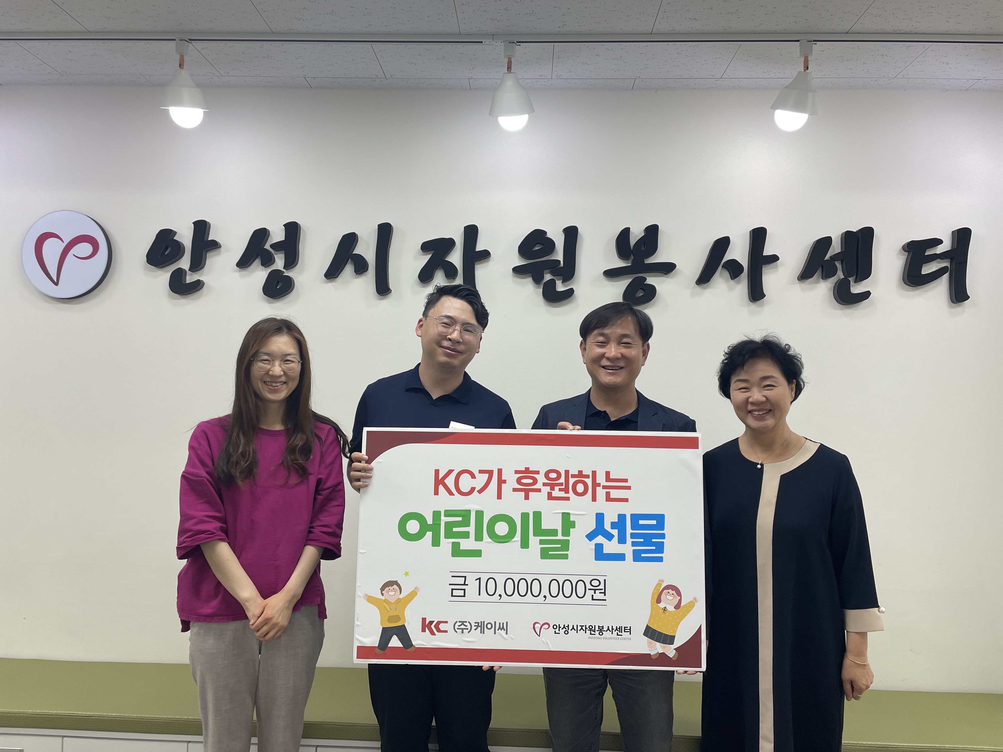 안성시기업사회공헌단인 (주)케이씨그룹이 5월 5일 어린이날을 맞이해 안성시 관내 어린이들을 위한 후원금 천만 원을 안성시자원봉사센터에 기탁했다. 이는 지역사회 저소득층 어린이 194명에게 장난감 교환권으로 배분될 예정이다.