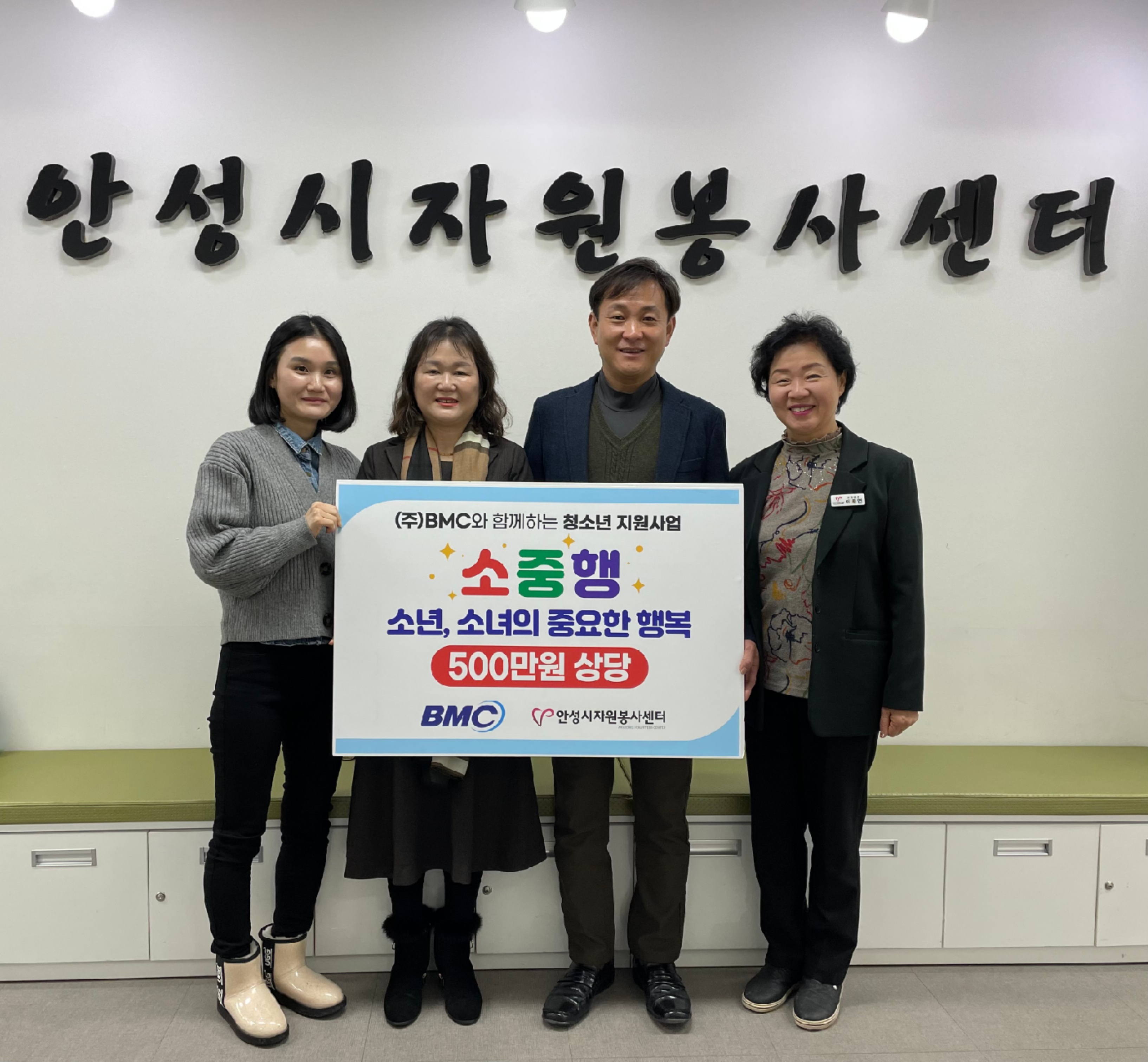이날 참석한 ㈜BMC 관리팀 김정례 이사는 "이번 지원을 통해 미래 자산인 청소년들이 건강하게 성장하길 바란다.“며 "앞으로도 취약계층을 위한 다양한 나눔 활동을 이어나갈 계획이다.“라고 전했다.