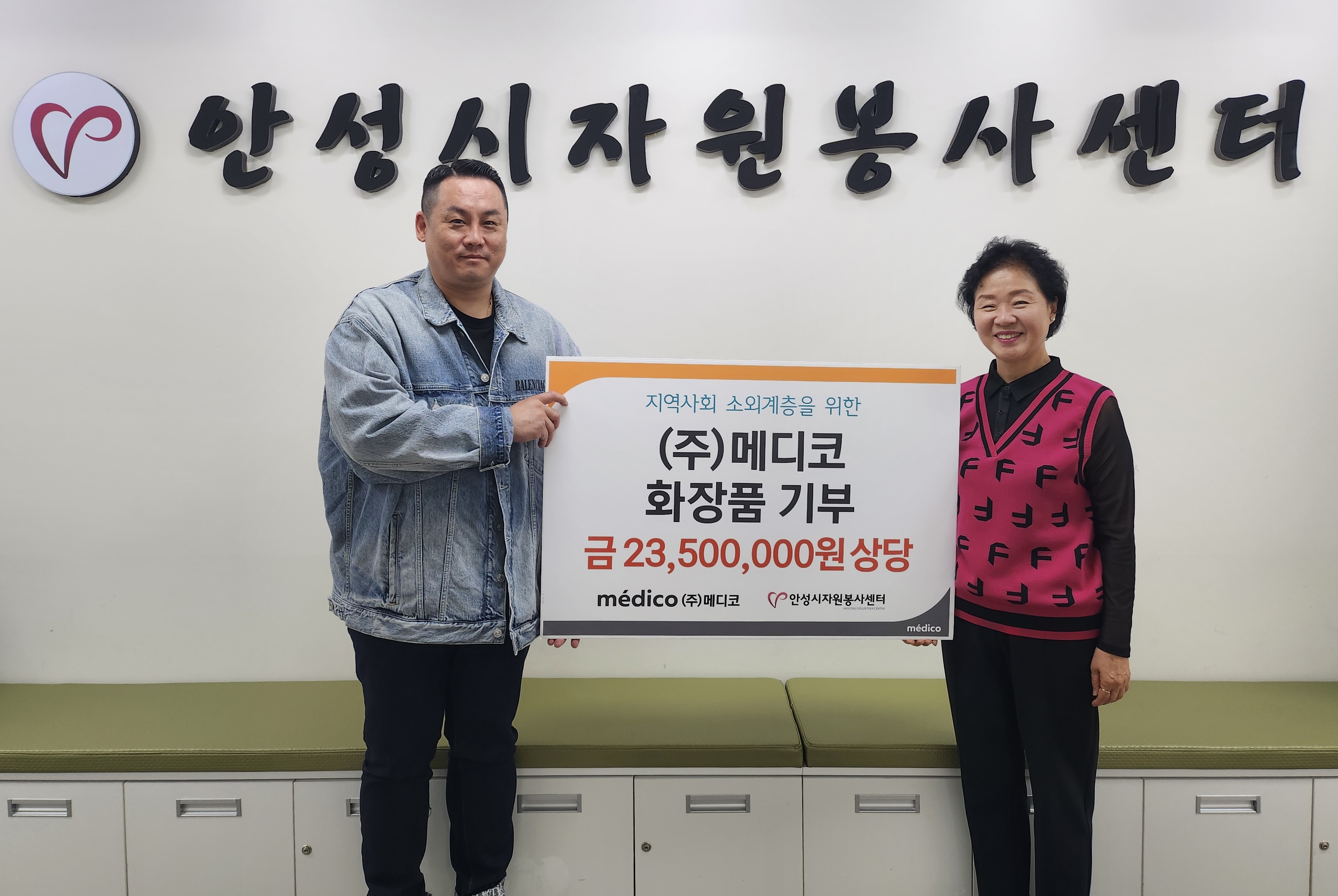 ㈜메디코는 2020년 설립된 회사로 경기 화성시 동탄순환대로 878 동탄 IT타워에 위치하고 있으며, 온‧오프라인 에스테틱 시장에서 사랑받는 국내 여러 브랜드뿐만 아니라 일본과 프랑스 등 해외 브랜드 화장품도 수입‧제조 및 판매하고 있다. ㈜메디코는 취약계층의 생활관리 향상을 위해 2023년에도 안성시자원봉사센터에 830만원 상당의 화장품을 기부한 바 있다.