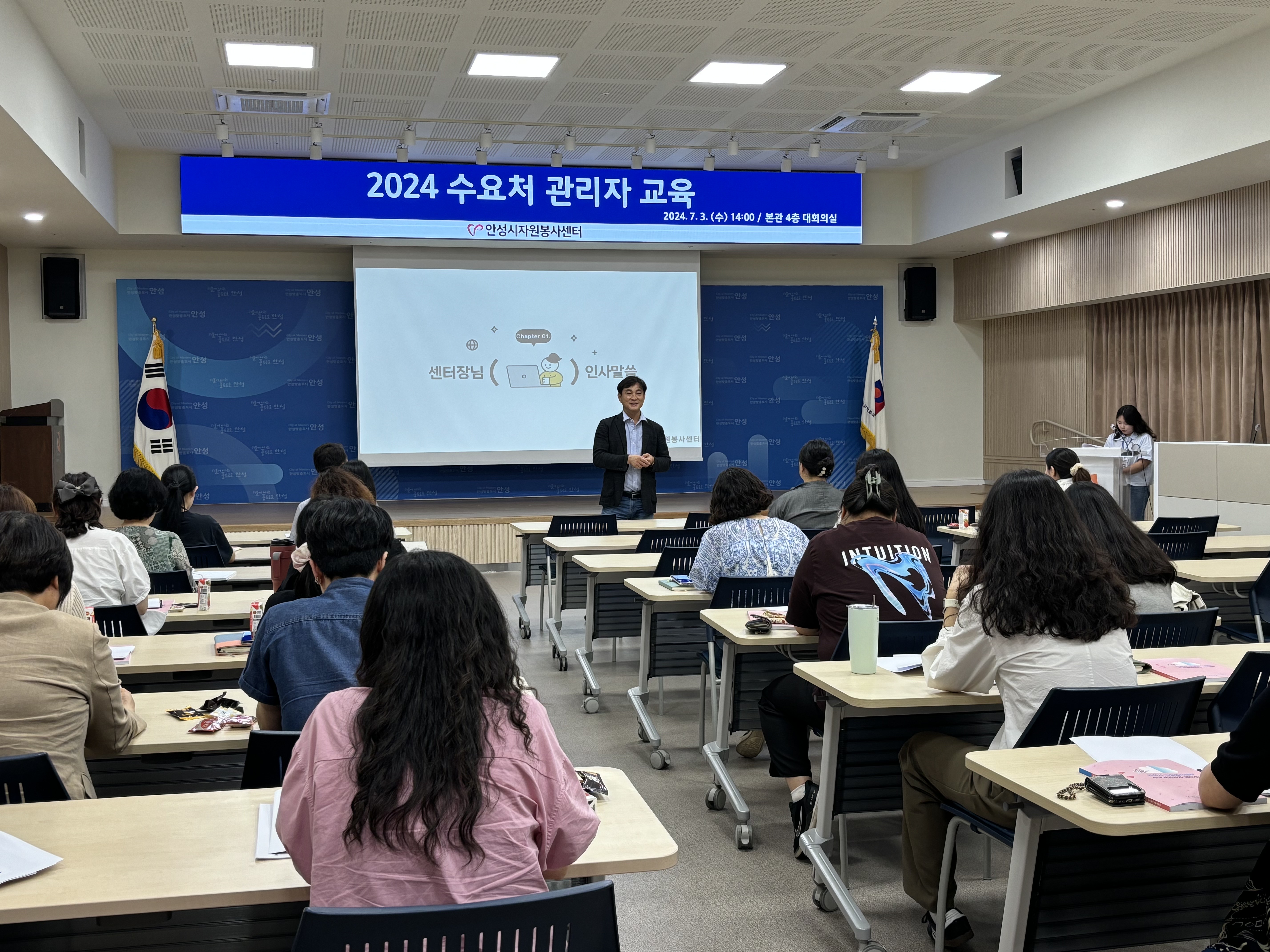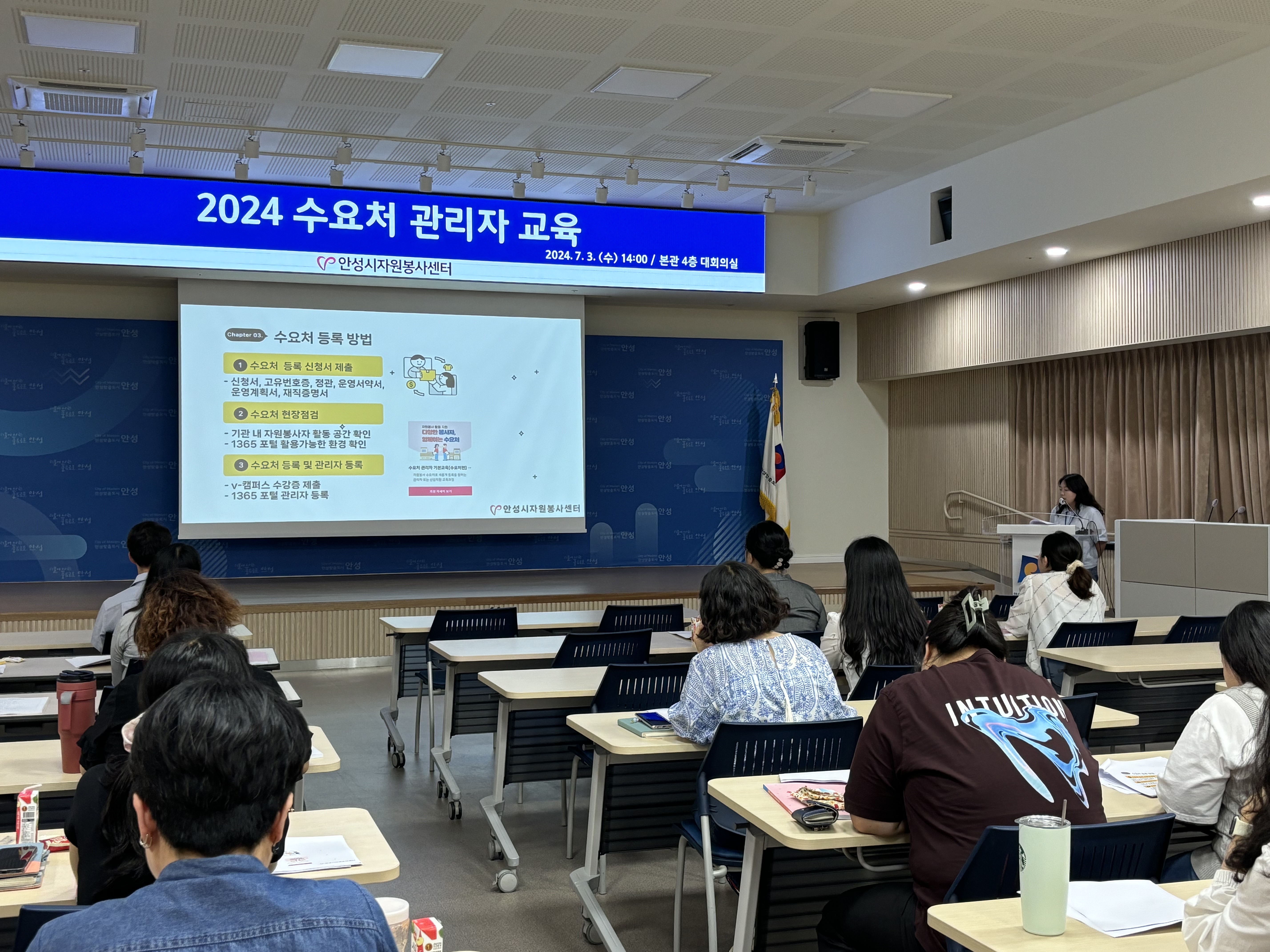 안성시자원봉사센터는 지난 7월 3일 안성시청 대회의실에서 ‘2024 수요처 관리자 교육’을 진행했다. 이날, 진행된 교육을 통해 안성시자원봉사센터는 자원봉사 수요처 관리자와 파트너십을 맺어 시대에 따라 변화하는 자원봉사 운영방식에 대한 고민을 나눴다.