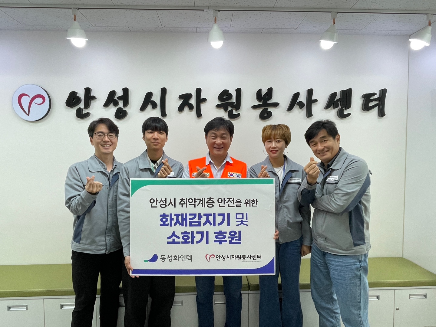 안성시자원봉사센터에서 진행된 전달식에는 ㈜동성화인텍 임직원 5명이 참여한 가운데 진행되었으며 이번 화재감지기 및 소화기 후원을 통해 안성시 취약계층 125가구가 화재의 위험으로부터 보호를 받을 수 있게 되었다.