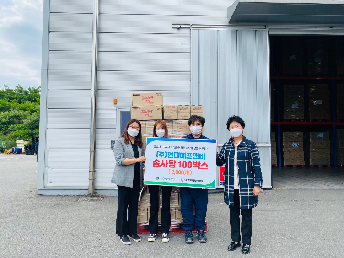 안성시 기업사회공헌단인 ㈜현대에프앤비는 2021년 5월 31일 자사 제품인 솜사탕 100박스(2000개, 330만원상당)을 안성시자원봉사센터에 전달하였습니다.
