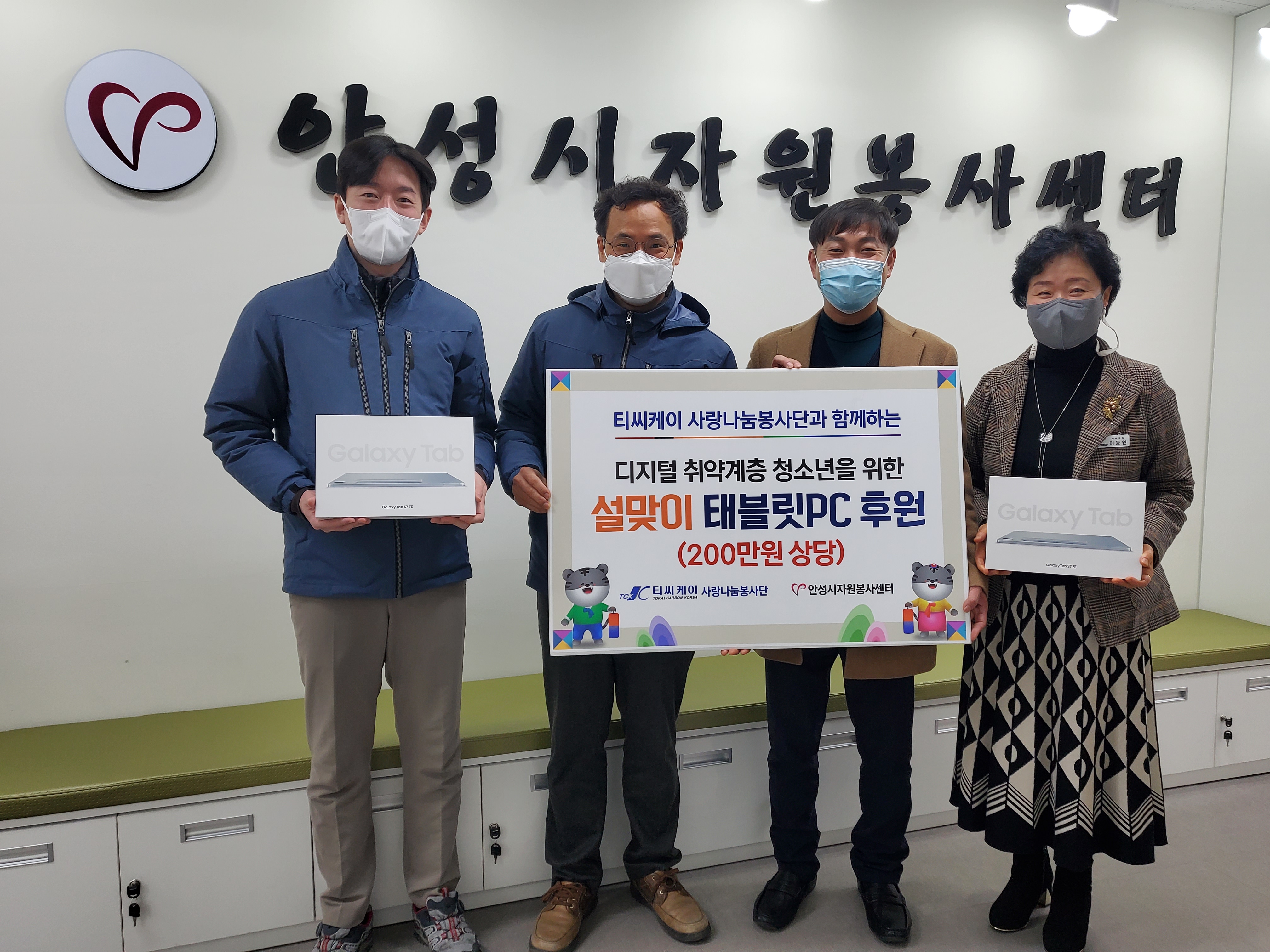 안성시기업사회공헌단 ㈜티씨케이 사랑나눔봉사단은 지난 1월 28일 설을 맞아 디지털 취약계층 청소년을 위한 설맞이 태블릿PC를 안성시자원봉사센터에 기탁했다.