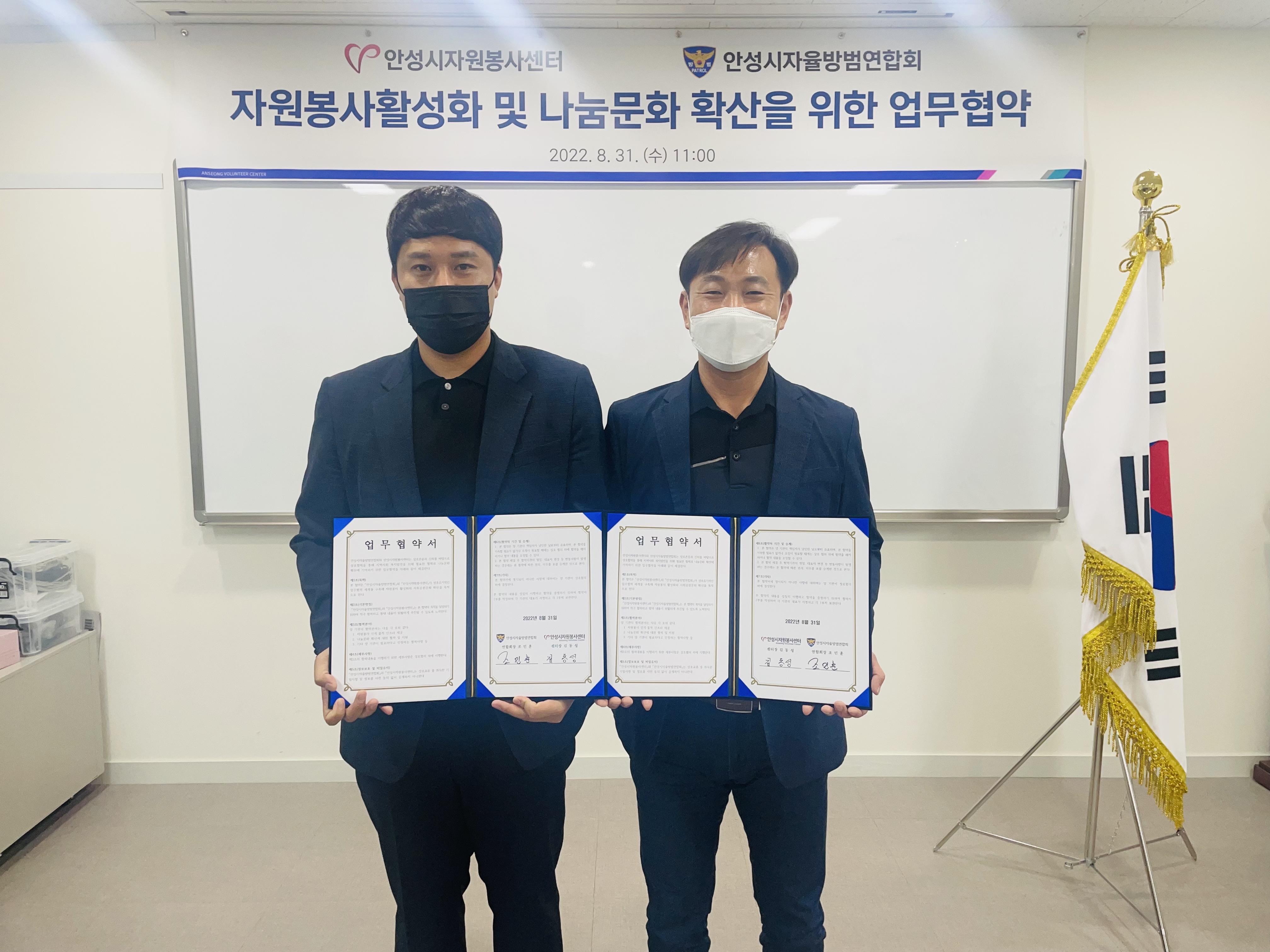 안성시자원봉사센터는 8월 31일 안성시자율방범연합회와 업무협약을 체결하였다.