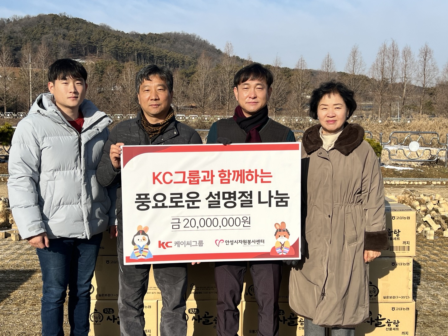 안성시기업사회공헌단 KC그룹은 안성시 명절 복지소외계층의 환경 개선을 위하여 ‘풍요로운선물 즐거운설날사업’을 추진하기 위한 기부금 2,000만원을 안성시자원봉사센터에 기탁했다.