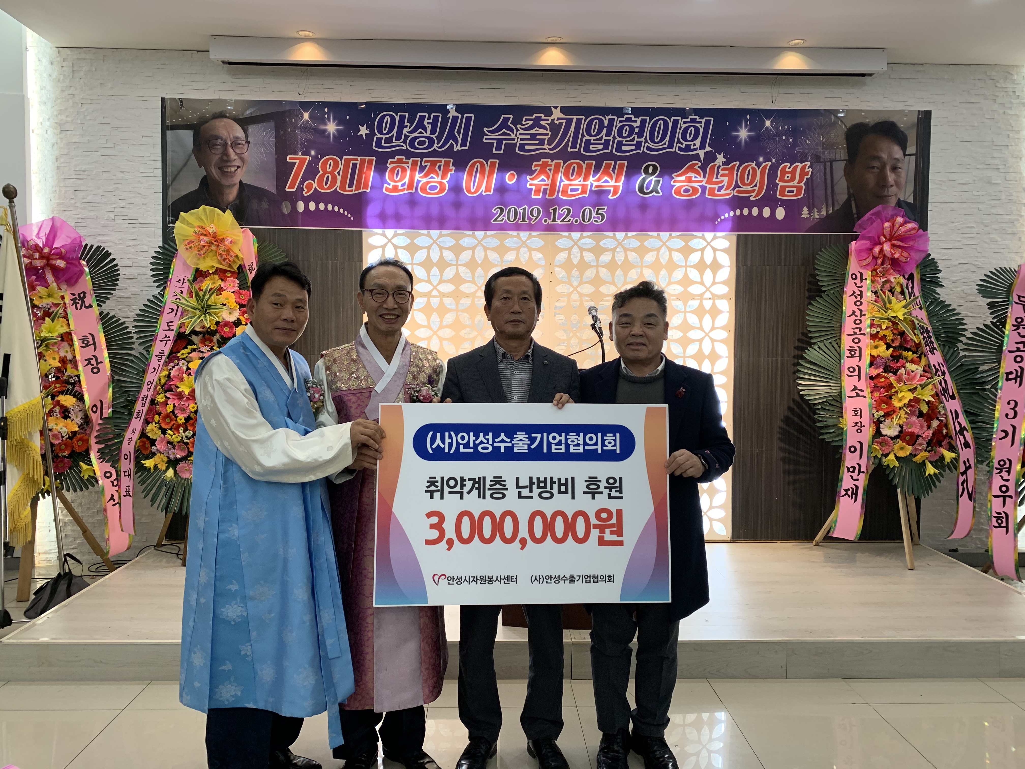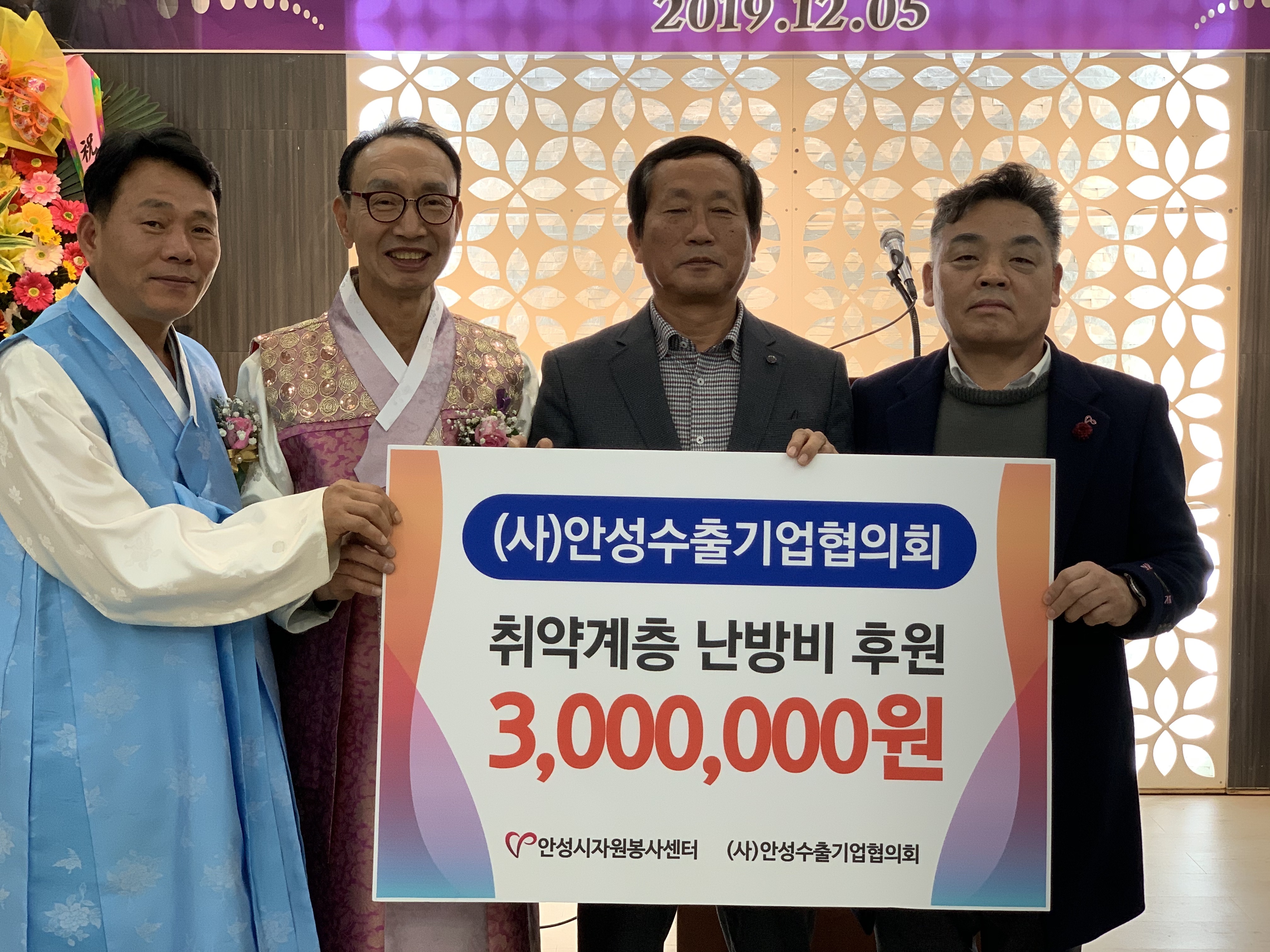 2019. 12. 5(목) (사)안성수출기업협의회는 안성 관내 난방취약계층을 위해 겨울 난방비 300만원을 안성시자원봉사센터에 기부하였습니다.