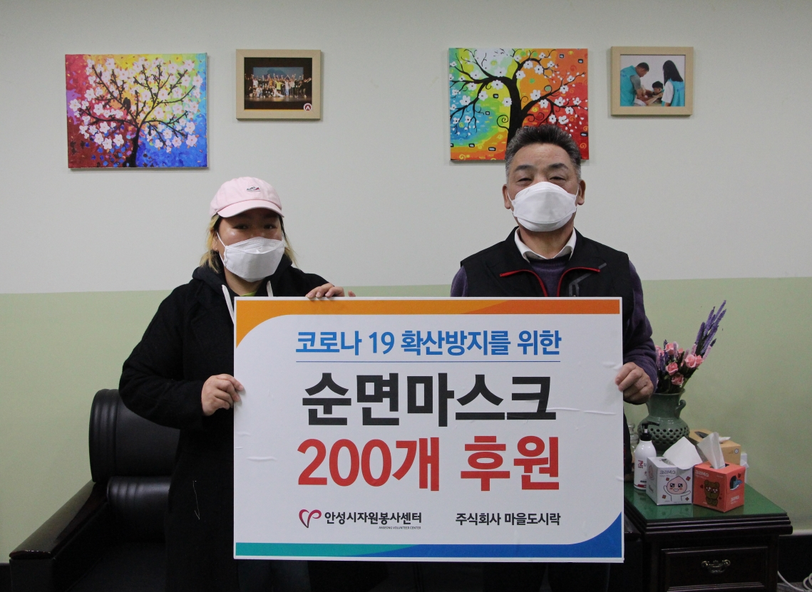2020년 3월 16일(월) 주식회사 마을도시락은 코로나19의 영향으로 마스크 품귀현상에 불안한 시민들을 위해 순면마스크 200개를 안성시자원봉사센터에 전달하였습니다. 이날 전달될 마스크는 마스크 구입이 어려운 사회복지시설 및 기관에 배부 될 예정입니다.