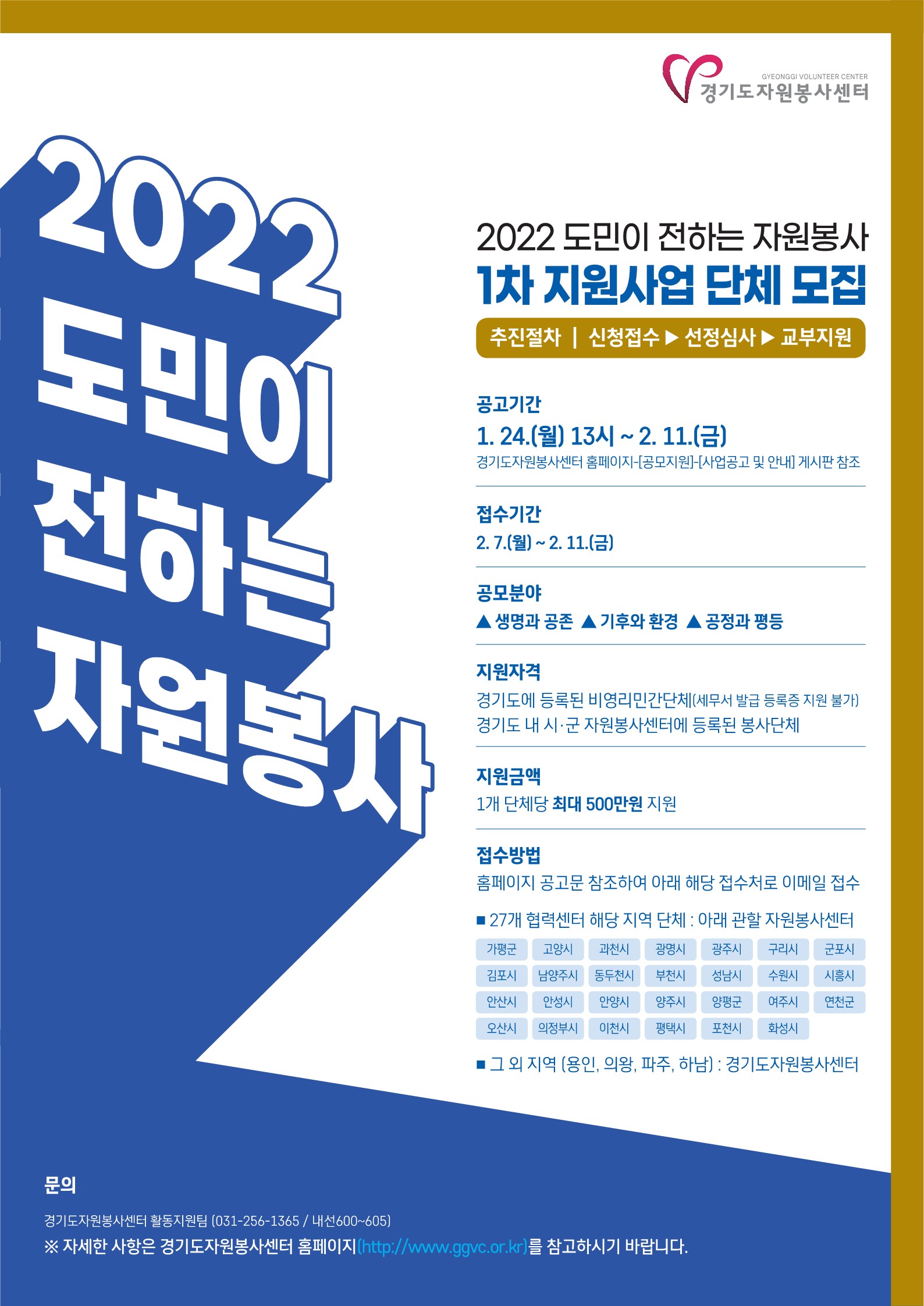 경기도민의 자원봉사 참여문화 확산 및 사회적 통합 구현을 위한 2022년 도민이 전하는 자원봉사 1차 지원사업을 시행합니다!
