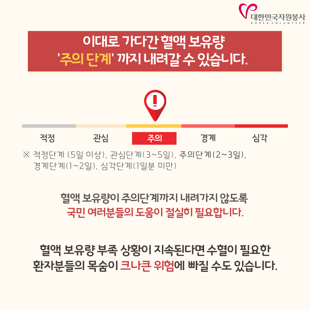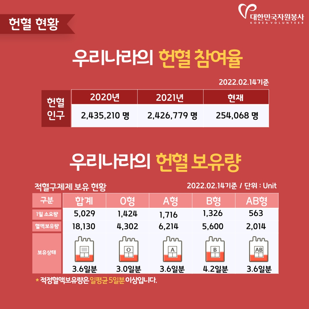 최근 코로나19 오미크론 확산과 2~3월 계절적 요인으로 혈액 일일보유량이 '주의단계'로 진입이 우려되는 상황입니다.