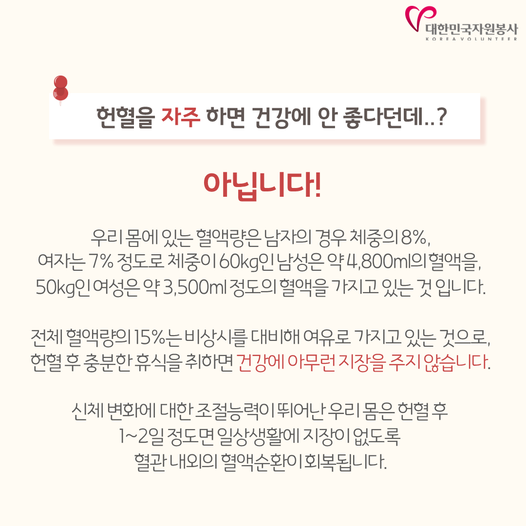 또한, 코로나19 백신 접종 이후 7일이 지나면 헌혈에 참여하실 수 있으며, 확진자의 경우도 완치 후 4주가 지나면 헌혈할 수 있습니다.