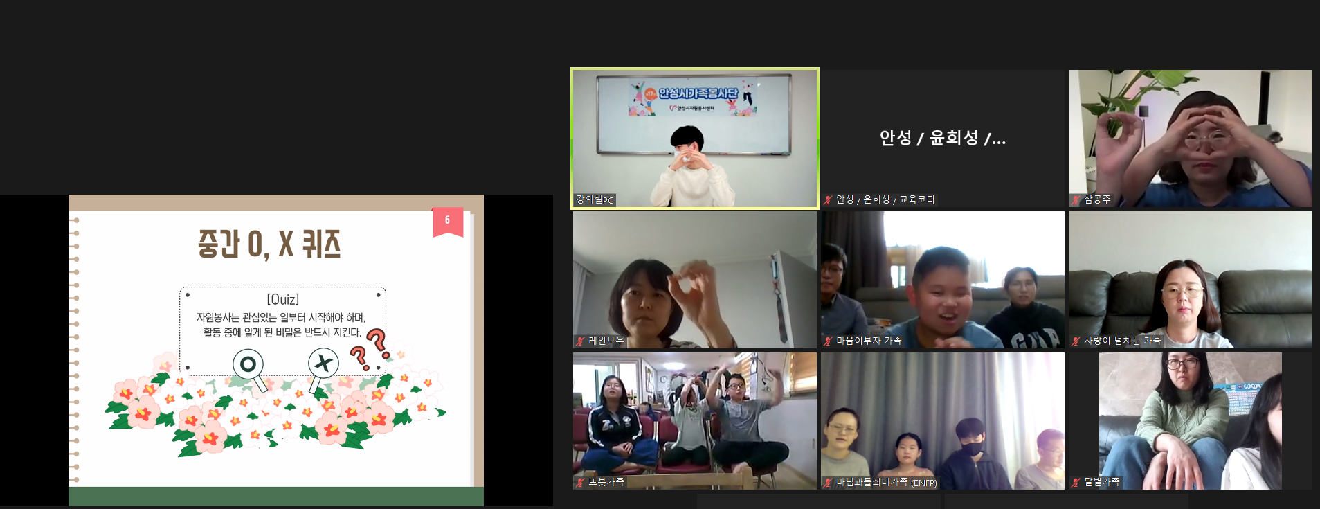[가족봉사단 17기 자원봉사교육 진행하다!] 가족봉사단 17기 자원봉사교육이 2022. 4. 9.(토)에 진행되었습니다. 코로나-19 확산에 따라 안성시자원봉사센터 강의실에서 ZOOM으로 진행되었으며, 자원봉사 교육을 진행하여 활동을 시작하기 전 자원봉사의 중요성을 다시 한 번 되짚어보는 시간을 가졌습니다. 가족봉사단 17기의 행보를 응원해주고 기대해주세요! #안성시자원봉사센터 #가족봉사단17기 #자원봉사 #교육