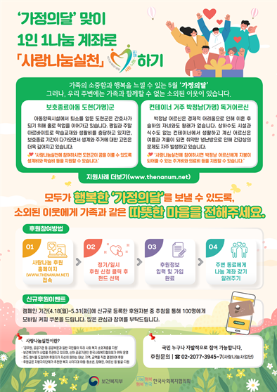 [가정의달 맞이 1인1나눔계좌 사랑나눔 캠페인에 참여해주세요!]