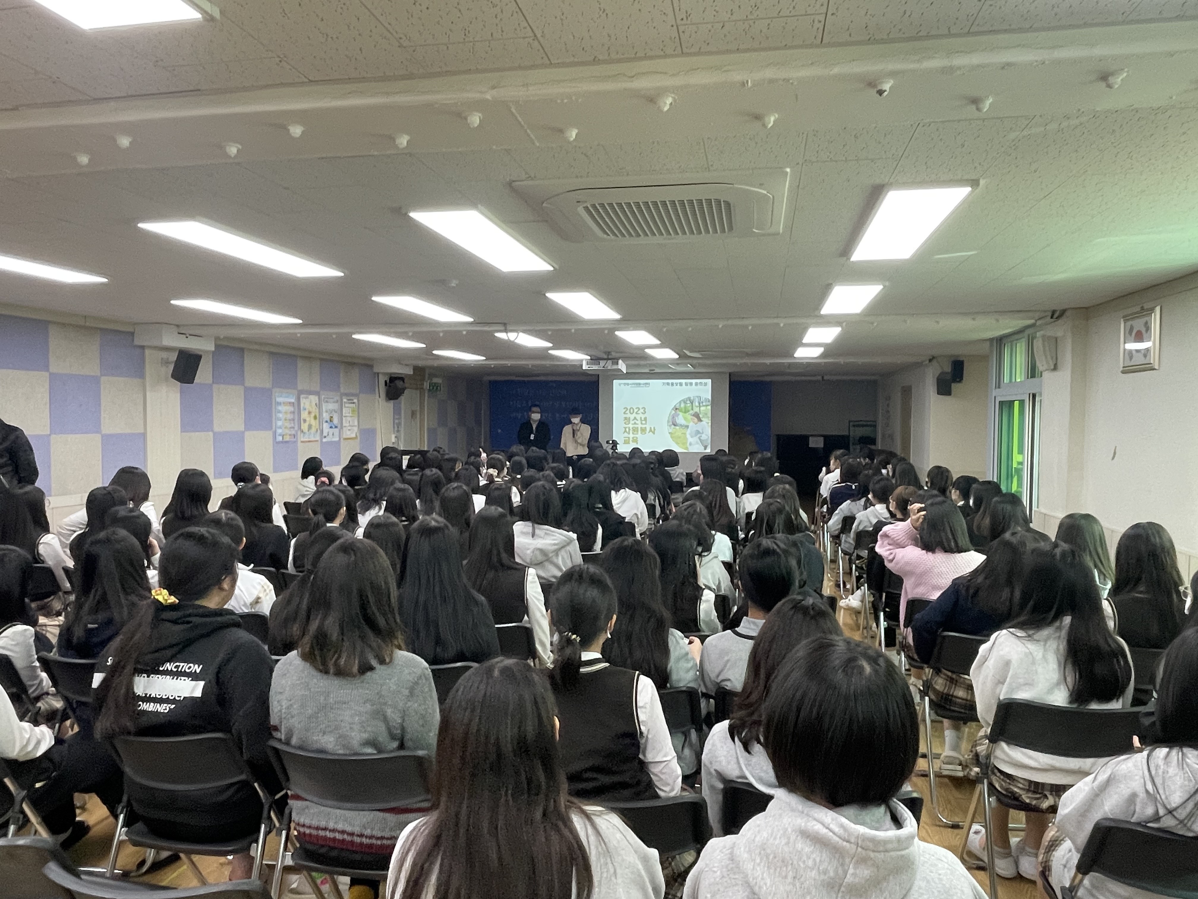 코로나 19 사회적 거리두기가 해제 됨에 따라 드디어 청소년들을 대면으로 만나뵙게 될 수 있었는데요? 전교생 435명을 대상으로 1학년은 대면, 2,3학년은 방송송출로 진행하였습니다.