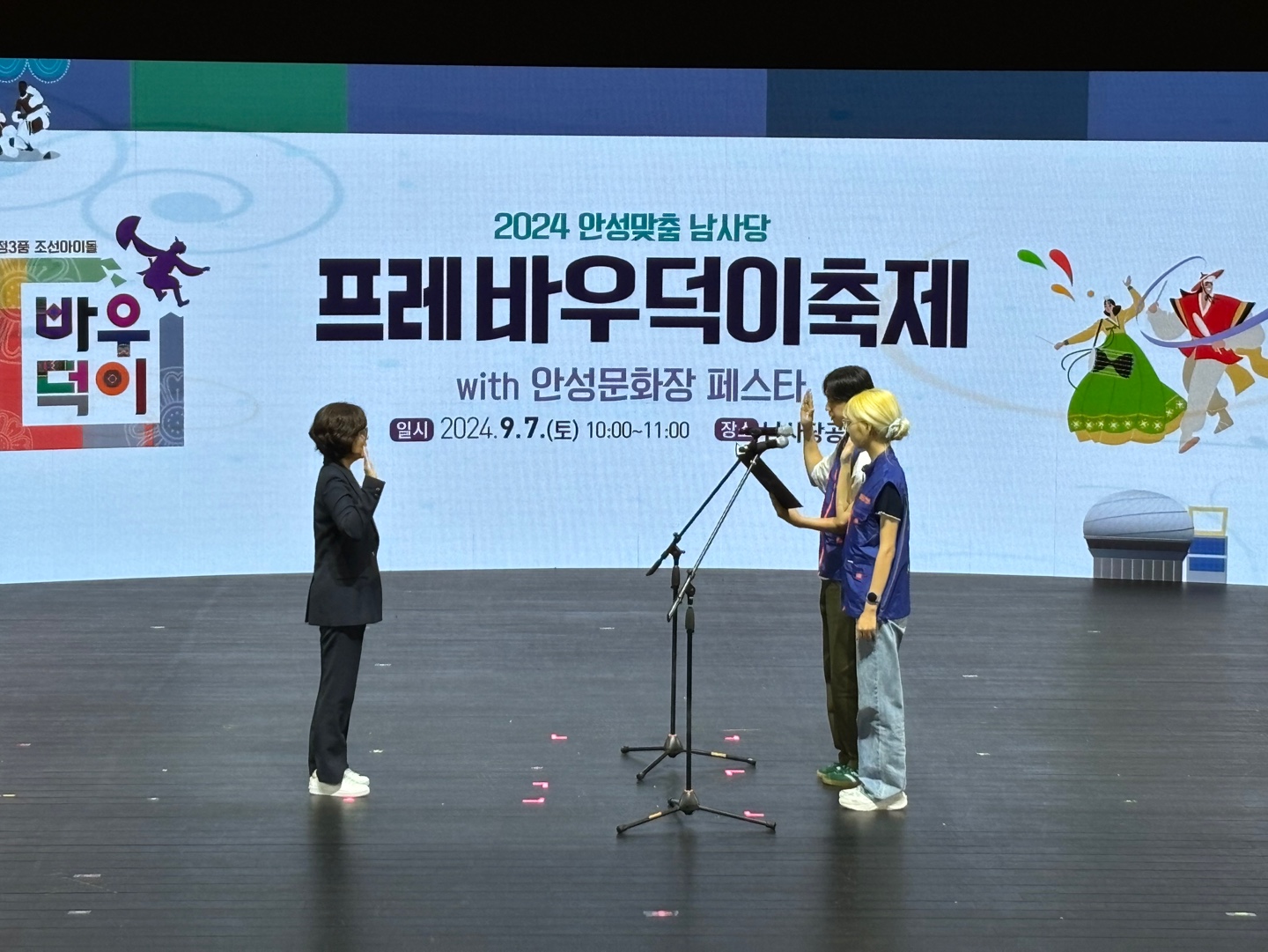 [안성맞춤 남사당 바우덕이 축제 자원봉사자 발대식 진행]지난 토요일 안성맞춤 남사당 바우덕이 축제를 시작하는 프레바우덕이 축제를 진행하였습니다.이번 발대식은 안성맞춤 남사당 바우덕이 축제에 함께하는 자원봉사자들과 대학생봉사단[드림런]이 함께 자원봉사 선서문을 진행하였습니다.이번 안성맞춤 남사당 바우덕이 축제에서도 시민들이 안전히 축제를 즐기고 관람할 수 있도록 자원봉사자들이 함께 할 것입니다.많이 놀러와주세요