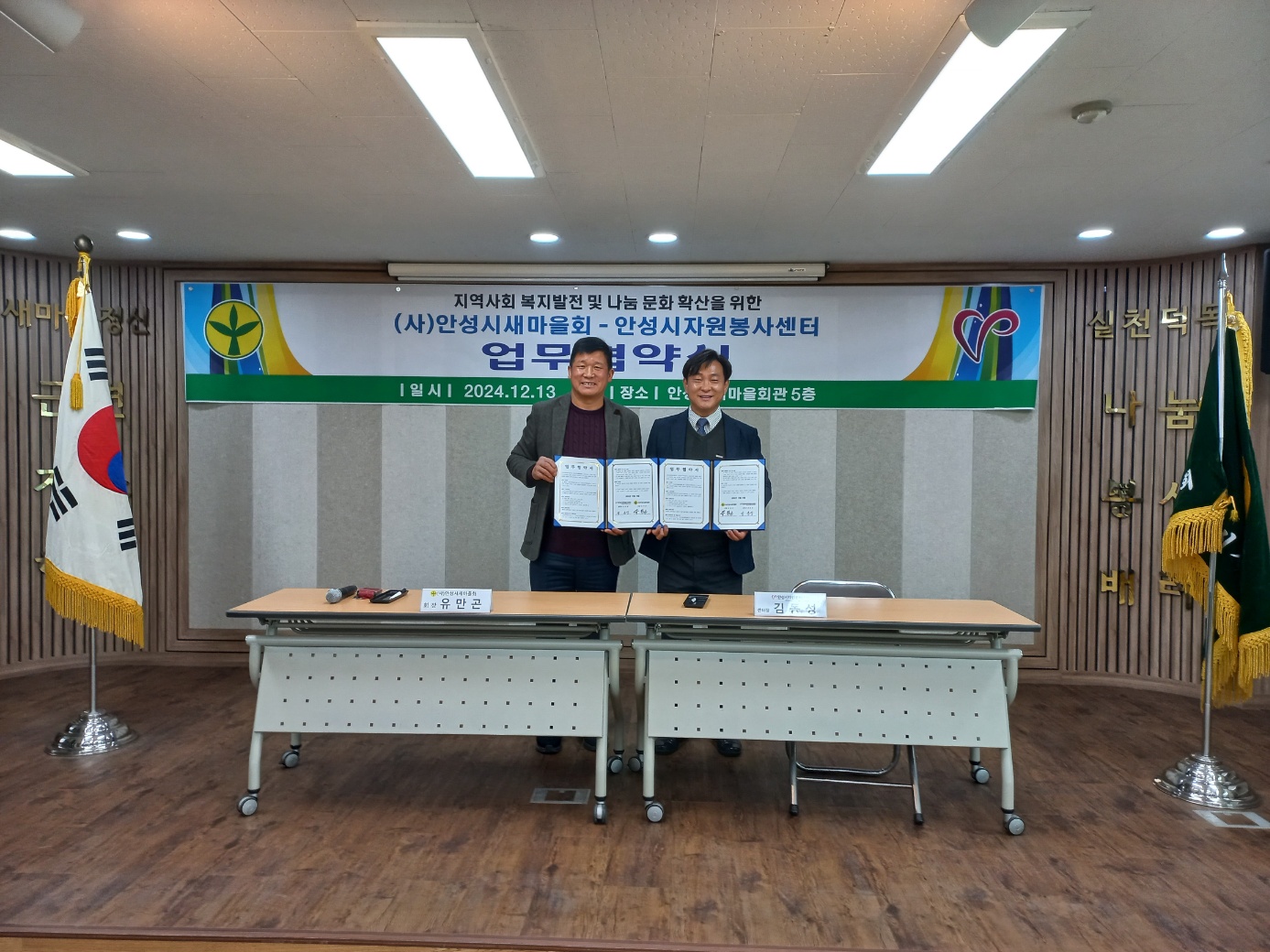 [(사)안성시새마을회 업무협약]지난 13일 (사)안성시새마을회와 안성시자원봉사센터는 지역사회 복지발전 및 나눔 문화 확산을 위해 업무협약을 맺었습니다.