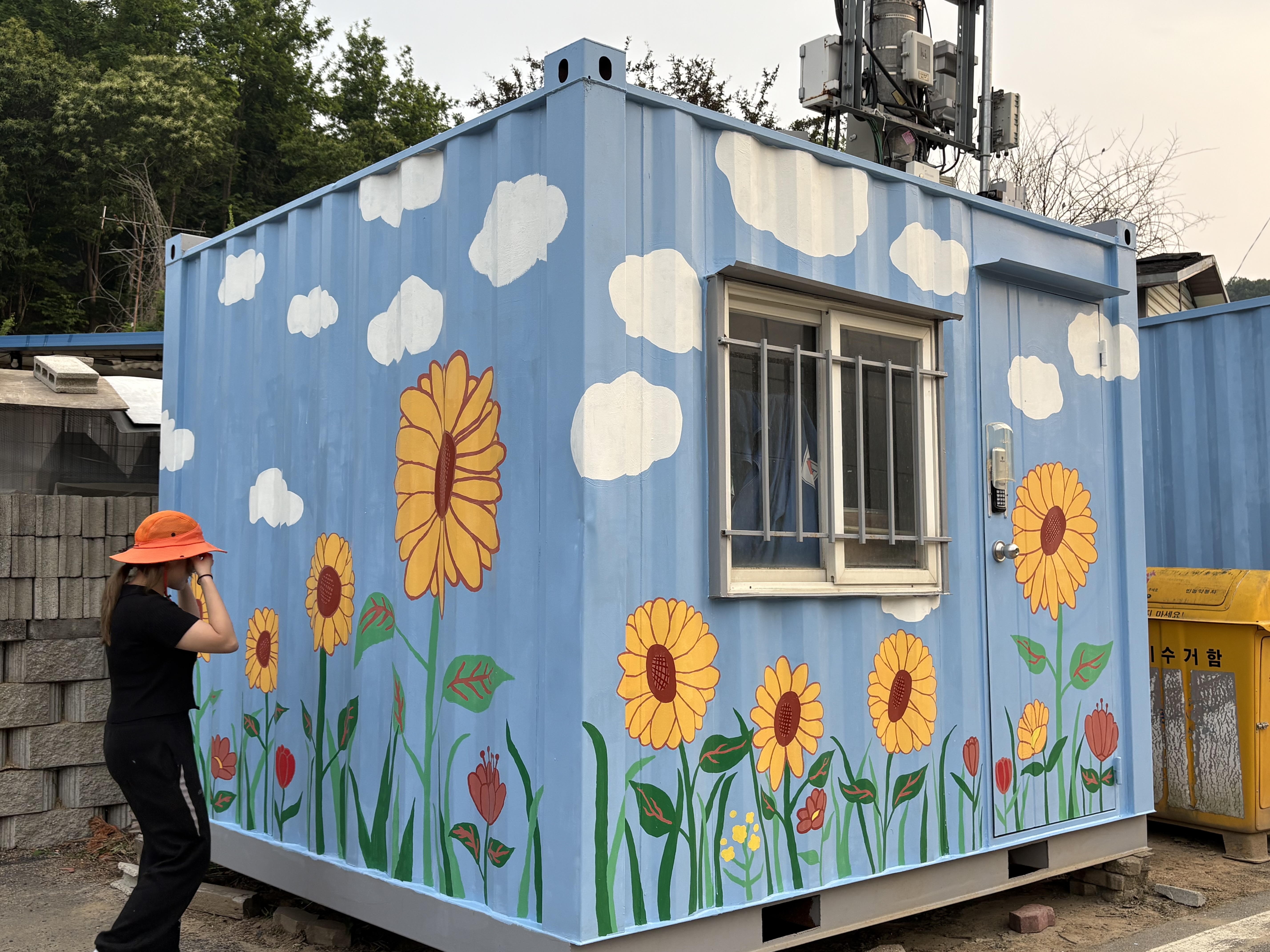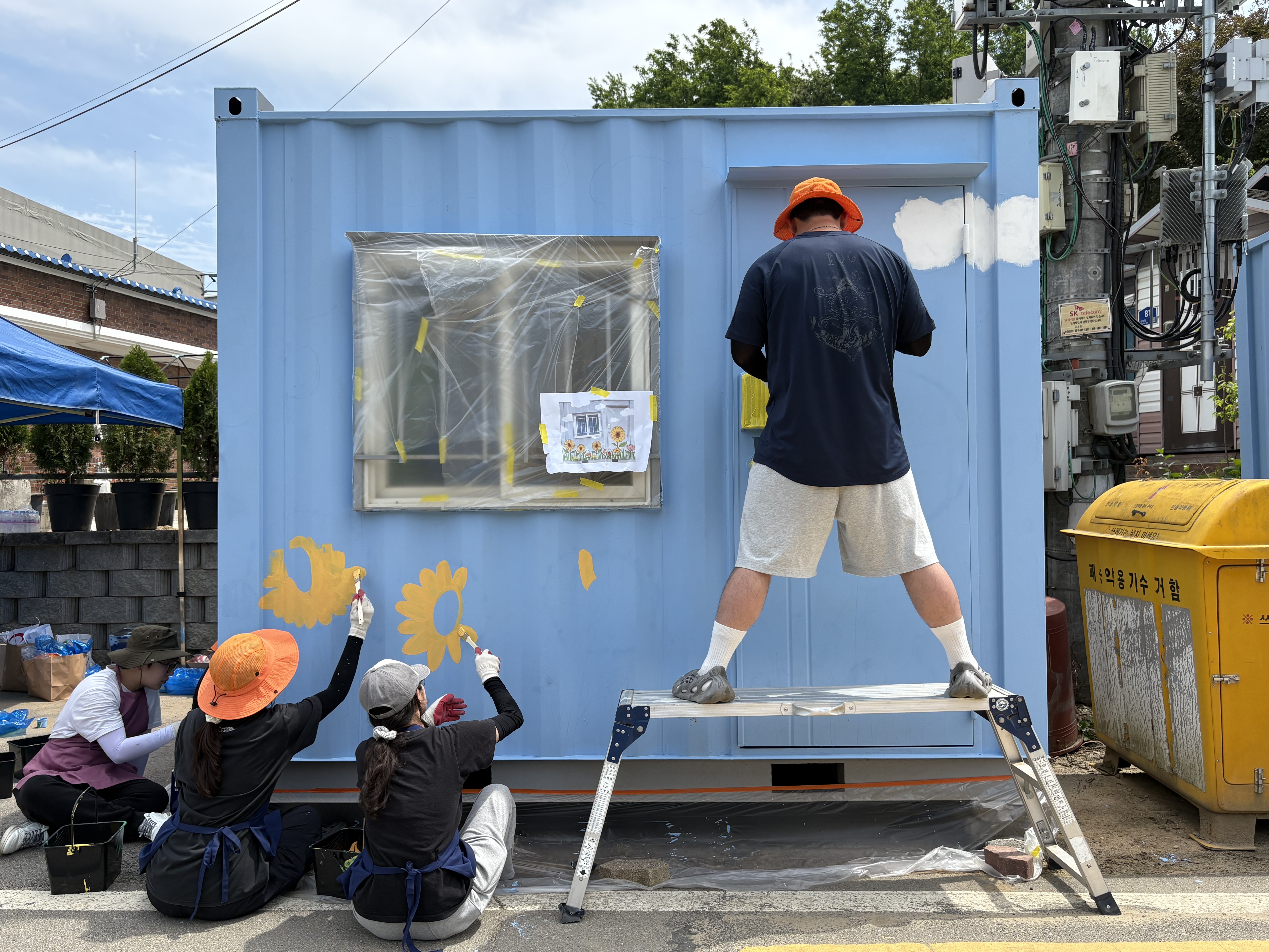 이번 활동에는 드림런 5기 대학생 봉사자들과 지역 주민 화가 등 20여 명이 참여하여, 마을 컨테이너 외벽에 주민 의견을 담은 벽화를 완성했습니다. 🌻☁️