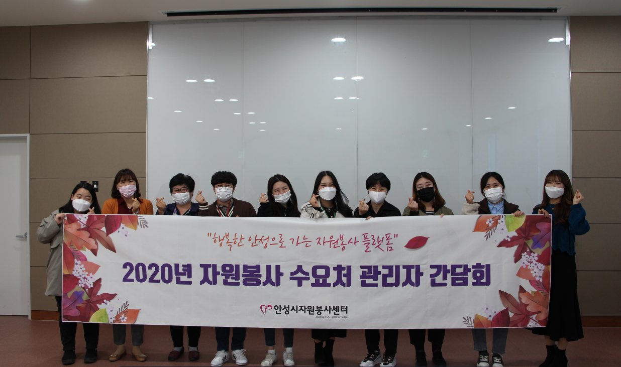 안성시자원봉사센터는 2020년 10월 21일(수) ~ 23일(금) 2회에 걸쳐 사회복지기관 및 시설 자원봉사 업무 담당자들을 대상으로 「2020 수요처 관리자 간담회」를 개최하였습니다.