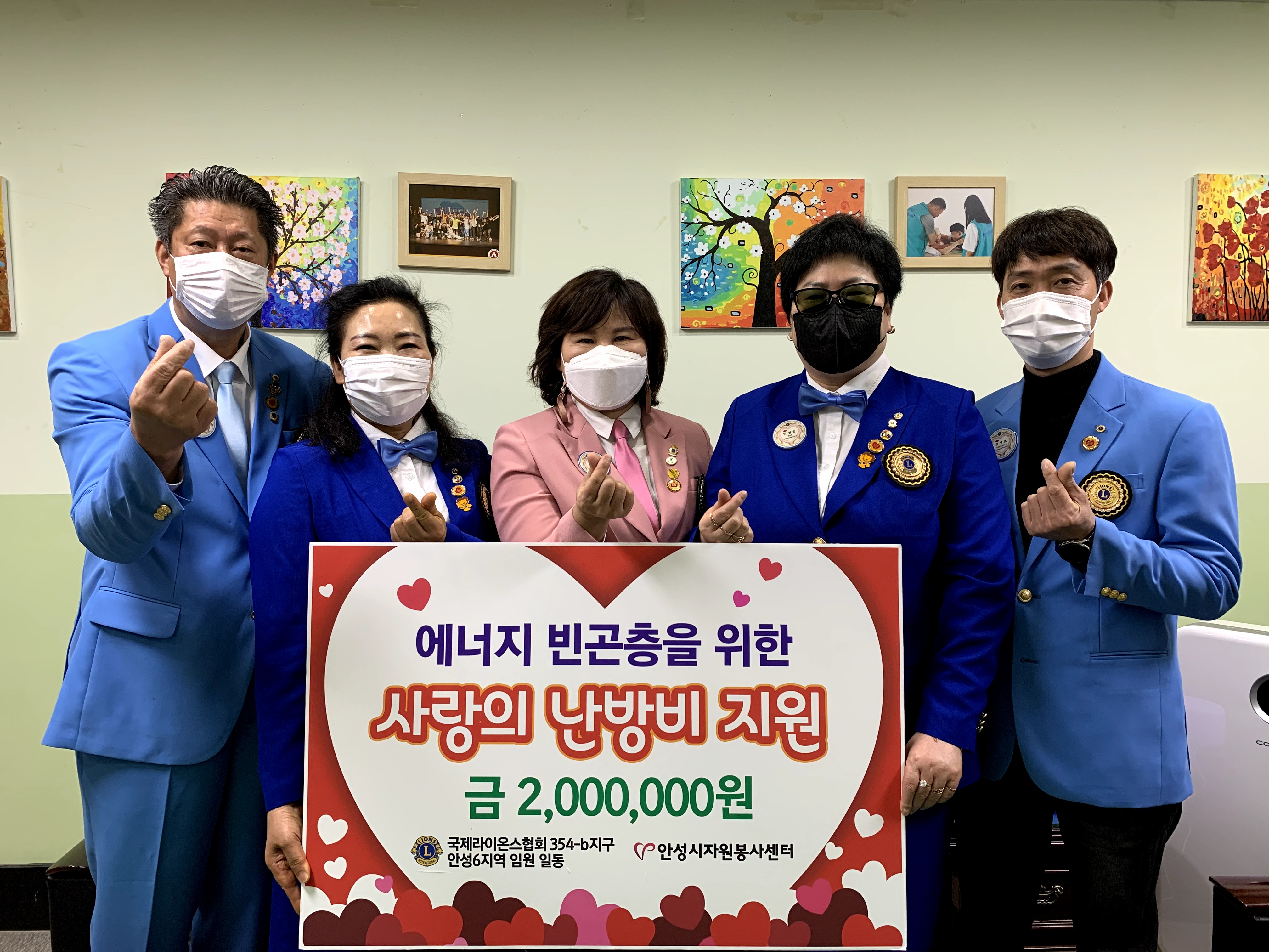 2021년 1월 28일(목) 국제라이온스협회354-b지구 안성6지역은 안성시자원봉사센터에 2,000,000원을 기탁하여 안성 관내의 취약계층이 겨울을 따듯하게 보낼 수 있도록 난방비 200만원을 지원하였습니다.